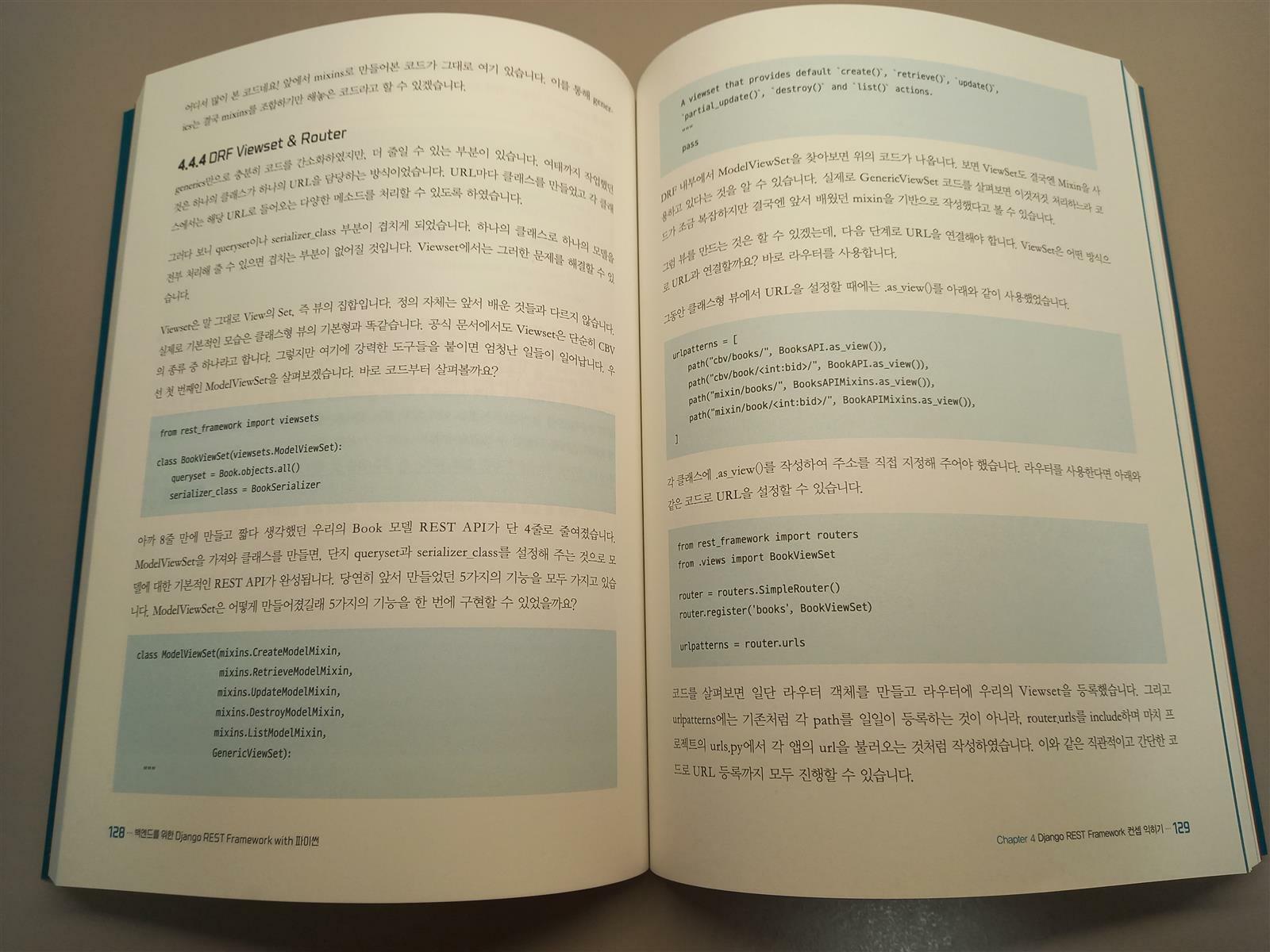 그리고 나서 장고 REST 프레임워크 사용법을 다루고 다시 To do 목록 API 를 만드는 법을 익힌다. 마지막으로는 장고 REST 프레임워크와 함께 React.js 를 병행하여 게시판 서비스를 만드는 것이 책의 최종 부분으로, 상당히 많은 분량에 걸쳐 상세하게 설명되어 있다.